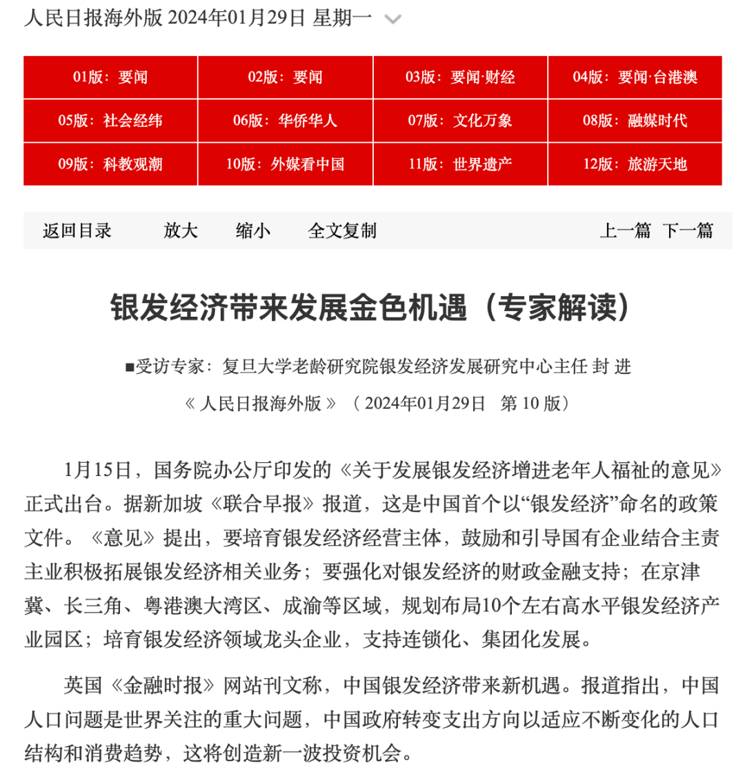 1月15日,国务院办公厅印发的《关于发展银发经济增进老年人福祉的意见》正式出台,引起社会各界热议。复旦大学老龄研究院银发经济发展研究中心主任封进教授接受人民日报海外版专访解读银发经济。