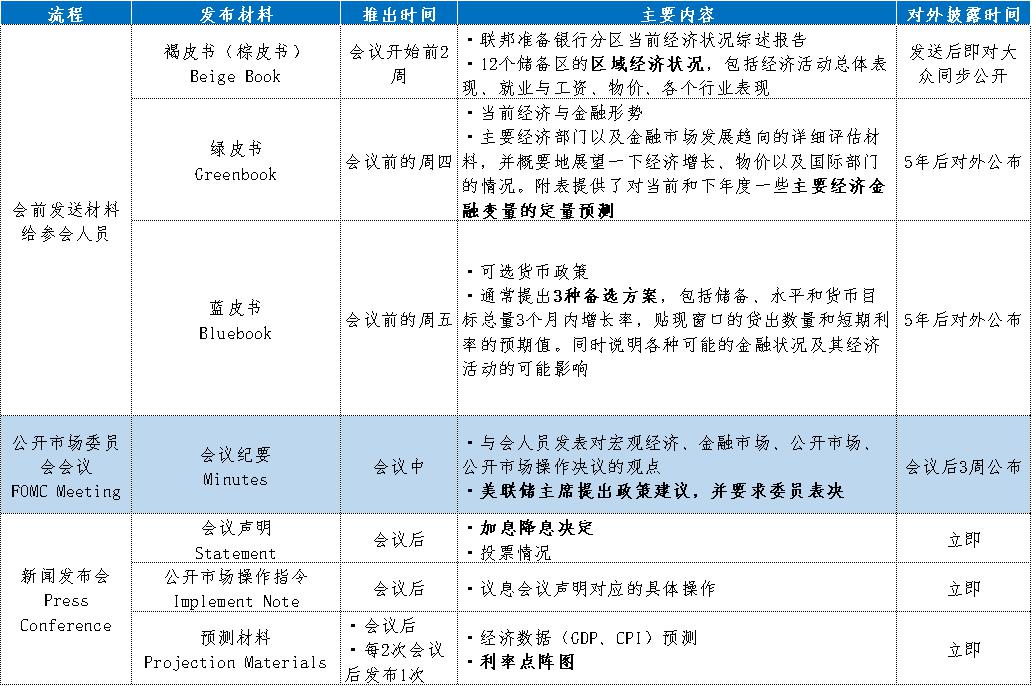 第一阶段,会前材料发送。主要指美联储编制的三本会议材料褐皮书、绿皮书和蓝皮书。褐皮书在发送后同步向大众公布,当中主要记录12家地方储备联行管辖区的地区经济状况。绿皮书则进一步给出未来经济与金融变量的定量预测。蓝皮书给出货币政策备选方案。绿皮书和蓝皮书均在发送后5年再公开。第二,举行议息会议。会议议程中,首先由参会人员就货币政策进行讨论,最后由美联储主席给出政策方案,要求参会人员表决。第三,会后的新闻发布会和相关材料公布。会后新闻发布会中,首先由美联储主席宣读会议声明,报告加息降息决定。随后发放的材料中给出公开市场操作指令,并给出预测材料。预测材料中含有未来经济数据的预测,和未来利率的可能路径。