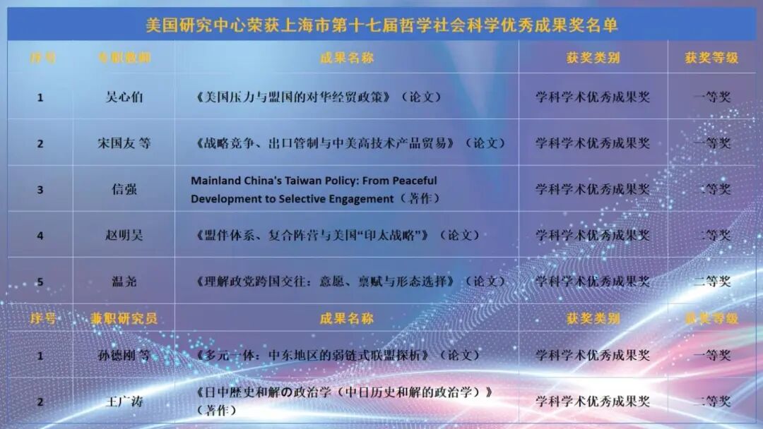 近期,上海市第十七届哲学社会科学优秀成果奖获奖名单公布,复旦大学美国研究中心专职教授吴心伯、宋国友分别荣获上海市第十七届哲学社会科学优秀成果奖一等奖各1项。中心专职教授信强、赵明昊和副教授温尧分别荣获二等奖各1项。中心兼职研究员孙德刚、副研究员王广涛分别荣获一等奖和二等奖各1项。具体获奖情况如下: