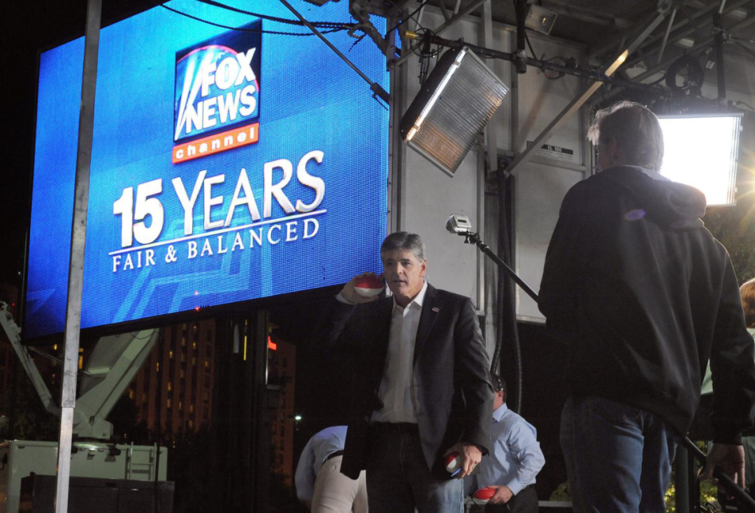 图:福克斯新闻主持人肖恩·汉尼蒂,其背后大屏幕上显示的正是福克斯新闻的口号“公平与平衡”。