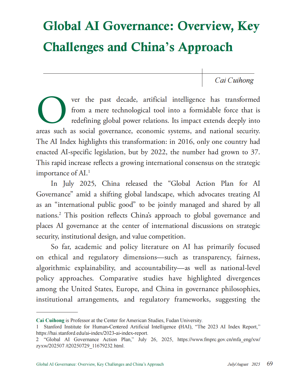摘要:近日,复旦大学国际问题研究院教授,全球人工智能创新治理中心副主任蔡翠红研究成果“Global AI Governance: Overview, Key Challenges and China’s Approach”(《全球人工智能治理:概况、关键挑战与中国方案》)...