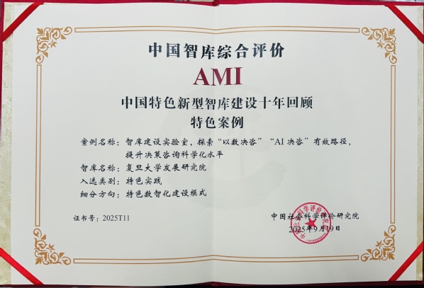 摘要:2025年9月,复旦发展研究院因在智库建设实验室中探索“以数决咨”“AI决咨”的创新路径,成功入选中国社会科学院评价研究院“中国特色新型智库建设十年回顾”特色案例,并获颁“特色数智化建设模式”证书。