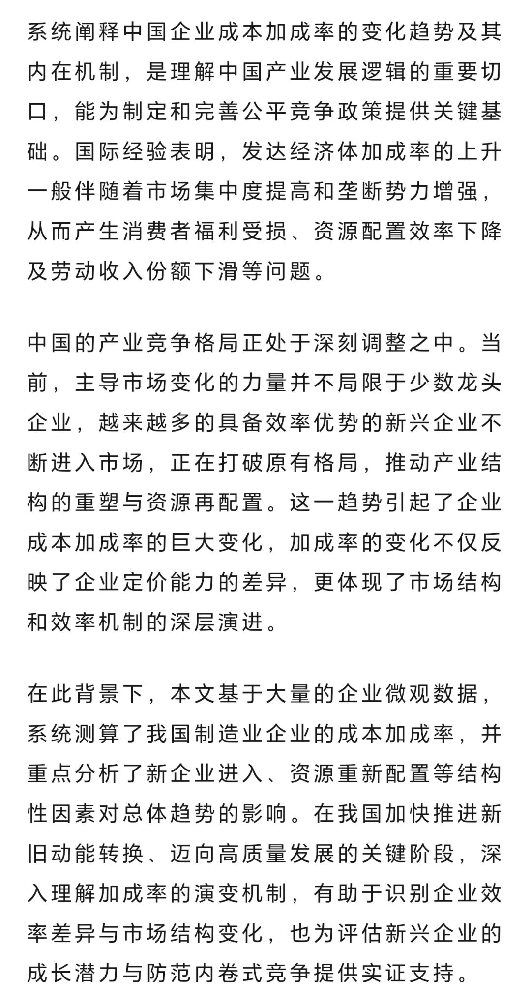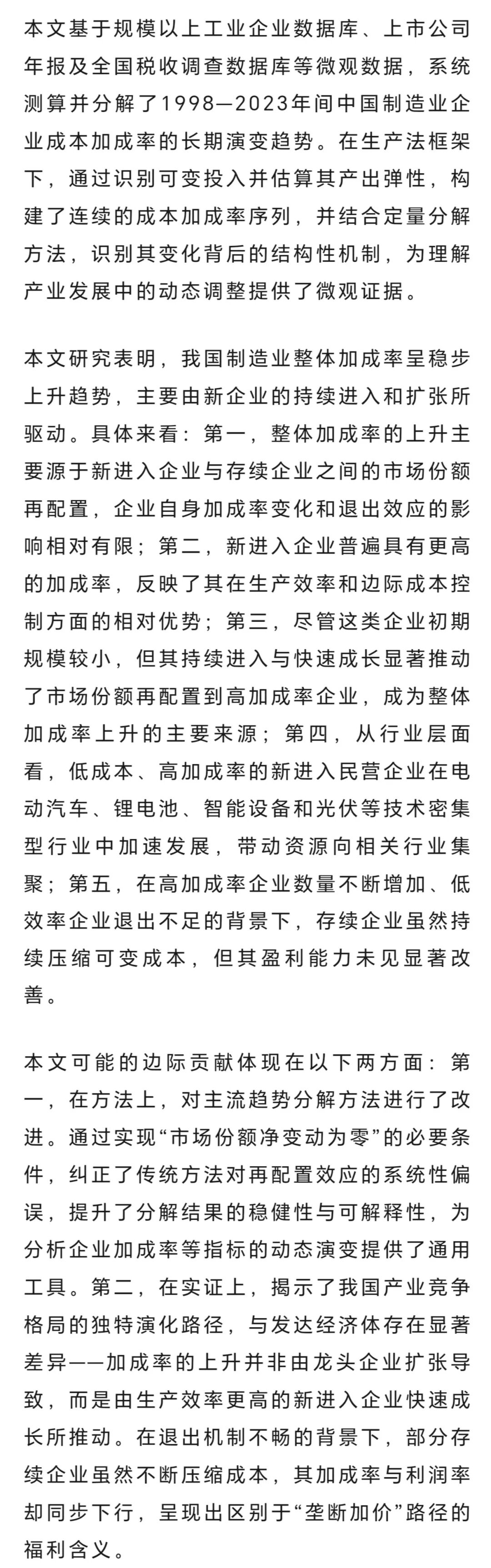 近日,复旦大学中国社会主义市场经济研究中心刘志阔、陈诺、马欣榕的合作论文“中国企业的成本加成率测算和趋势分解:1998—2023”在《经济研究》2025年第4期发表。