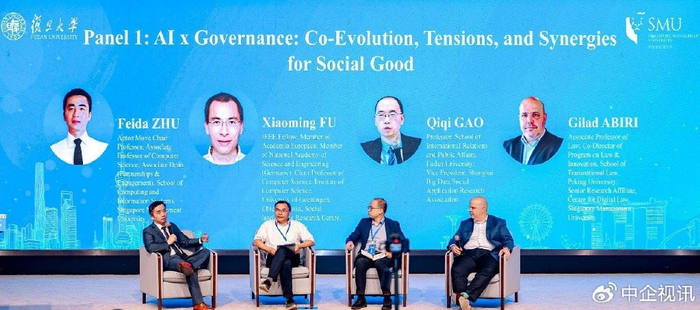 第一场圆桌讨论以“AI × 治理:社会公益的共同进化、对立与协同作用”为主题,由朱飞达副院长主持。与谈嘉宾包括傅晓明教授、复旦大学国际关系与公共事务学院教授高奇琦,以及Gilad ABIRI副教授。