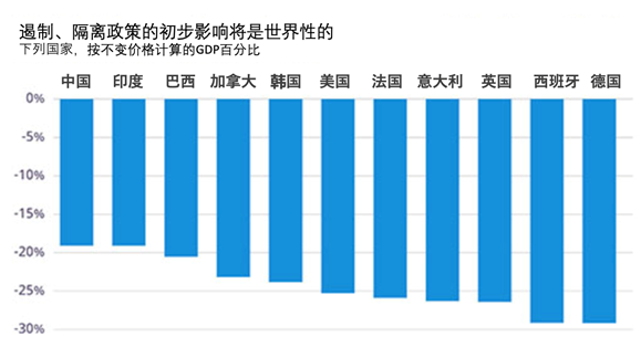 经合组织(OCED)在近日发布的《G20峰会探讨全球经济前景》报告中指出,以各国GDP为标杆,遏制、隔离政策的初步影响将是世界性的(如下图)。