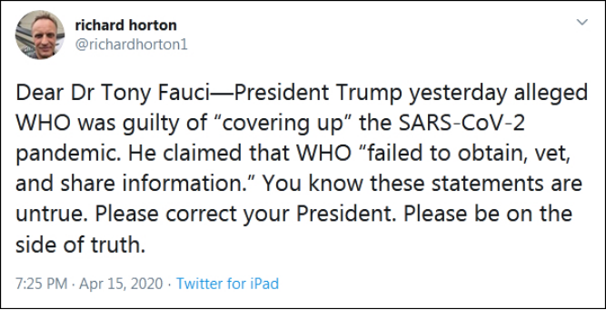 科学家和医务工作者对特朗普的行为表示反对。知名医学杂志《柳叶刀》主编理查德·霍顿(Richard Horton)在4月15日发推称,特朗普的决定简直是“对全人类的犯罪”(a crime against humanity),呼吁全世界的科学家、医务工作者和公民反对这一对全球团结的背叛之举。他还呼吁美国传染病专家安东尼·福奇(Anthony Fauci)纠正特朗普的错误,选择“站在真理的这一边”(Please be on the side of truth)。