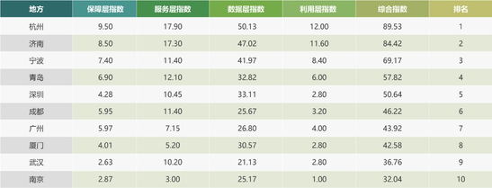 副省级开放数林指数排名前十的地方如下表所示,杭州综合表现最优,位列第一,济南和宁波也表现优秀。