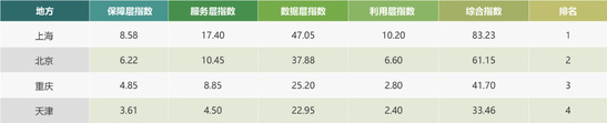 四个直辖市开放数林指数分值和排名如下表所示,上海市综合表现最优,位列第一。