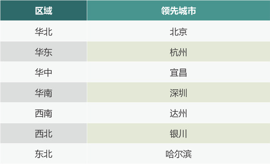 在各大区域中,排名领先的城市如下表所示。华北地区领先城市为北京,华东地区领先城市为杭州,华中地区领先城市为宜昌,华南地区领先城市为深圳,西南地区领先城市为达州,西北地区领先城市为银川,东北地区领先城市为哈尔滨。