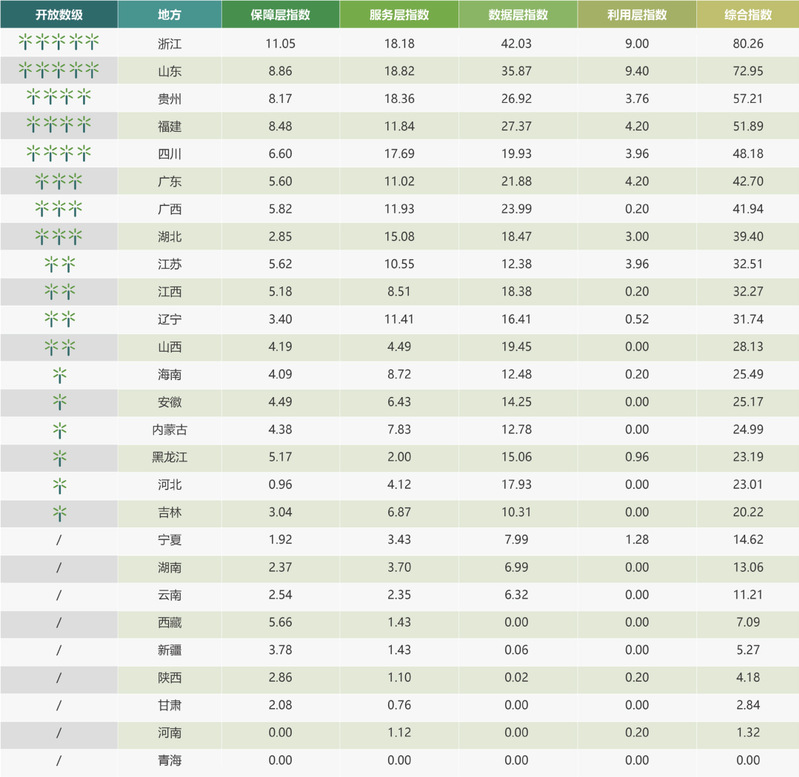2025年度全国省域开放数林指数分值如下表所示。报告基于综合指数分值将各地的公共数据开放利用水平分为五个“开放数级”。浙江、山东综合表现最优,进入第一等级“五棵数”,获得“数开繁盛”大奖。贵州、福建与四川也总体表现优秀,进入第二等级“四棵数”,其次是广东、广西与湖北,进入第三等级“三棵数”。在四个单项维度上,浙江在保障层、数据层表现最优,山东在服务层、利用层上表现最优。湖北和山西进步显著,获得“数飞猛进”奖。