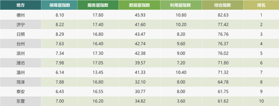地级开放数林指数排名前十的城市如下表所示,德州综合表现最优,位列第一;济宁、日照、台州、滨州、潍坊等地也表现优秀。