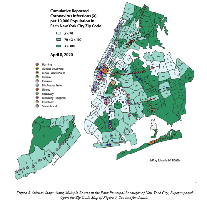 (来源:Harris, Jeffrey E. “The Subways Seeded the Massive Coronavirus Epidemic in New York City.”The National Bureau of Economic Research. Apr. 2020.www.nber.org/papers/w27021.pdf.)
