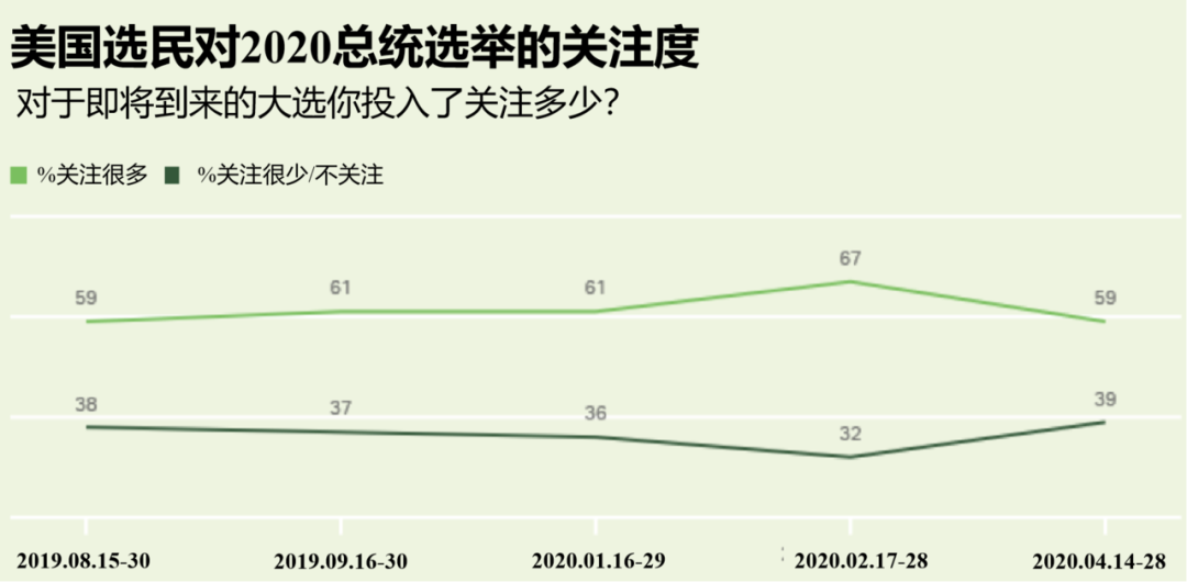 如下图所示,由于民主党总统初选环节的火热进行,美国民众对大选的关注度在2020年2月左右达到峰值,此后由于美国新冠疫情肆虐,表示对大选“十分关注”大选的民众比例从67%下降到了59%,基本回到了2019年8月总统初选尚未开始的时期。
