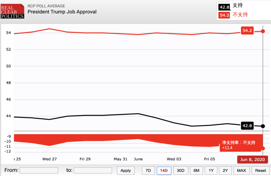图为特朗普过去14天的支持率变化。图片来源:Realclearpolitics,作者编译。