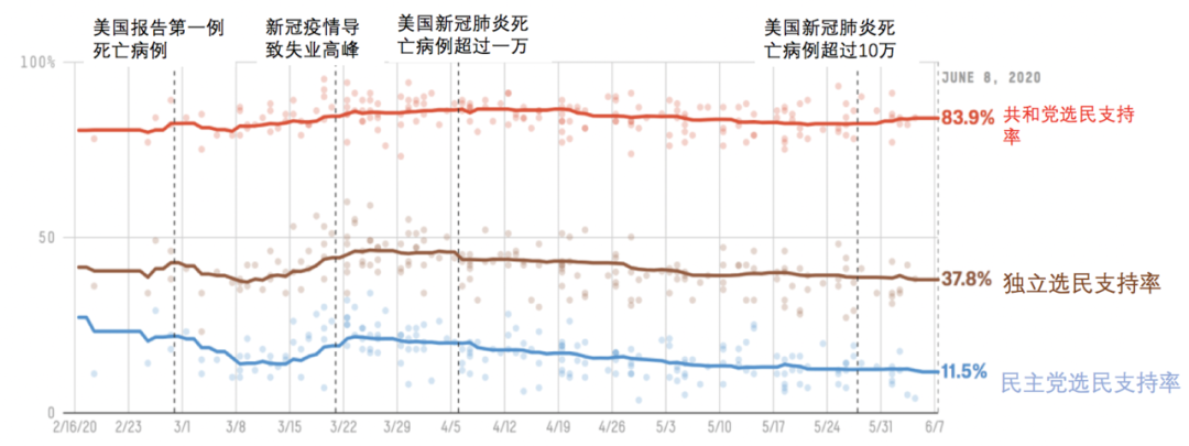 图为按照选民党派立场汇总的支持率。数据来源:盖洛普民调公司(Gallup);图片来源:作者自制。