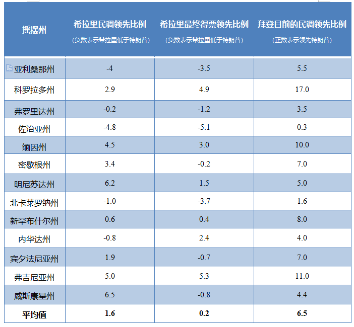 第三,在至关重要的摇摆州,拜登的民调支持率不仅高于特朗普,而且高于2016年大选中同一时期的希拉里·克林顿的民调支持率,还高于希拉里·克林顿的实际得票率。