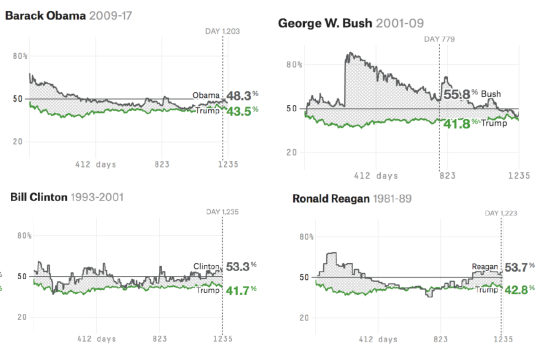 将特朗普与此前历届总统的支持率进行同期比较,会发现特朗普的支持率波动幅度是相较而言最小的。下图分别为特朗普与奥巴马、乔治·W·布什、比尔·克林顿和罗纳德·里根的支持率的同期对比,绿色曲线表示特朗普的支持率变化,黑色曲线表示其他几位总统的支持率变化。