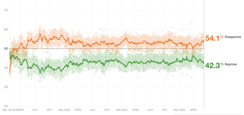 特朗普在过去四年内的支持率变动情况,图片来源:FiveThirtyEight