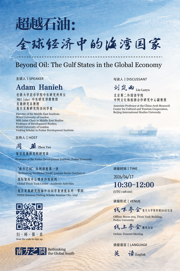 随着当前美以对伊朗的战争进入第六周,许多评论都聚焦于这场冲突对全球油价以及通过霍尔木兹海峡的碳氢化合物出口流量的潜在影响。本次讲座将对海湾国家及其在全球经济中的地位进行更深入的分析,探讨过去十年间海湾国家经济如何实现多元化,从而深度参与包括化肥和化学品在内的其他一系列关键商品领域。从这一视角出发,讲座将探讨这场战争持续下去会给全球南方其他国家带来的极其严重的后果。