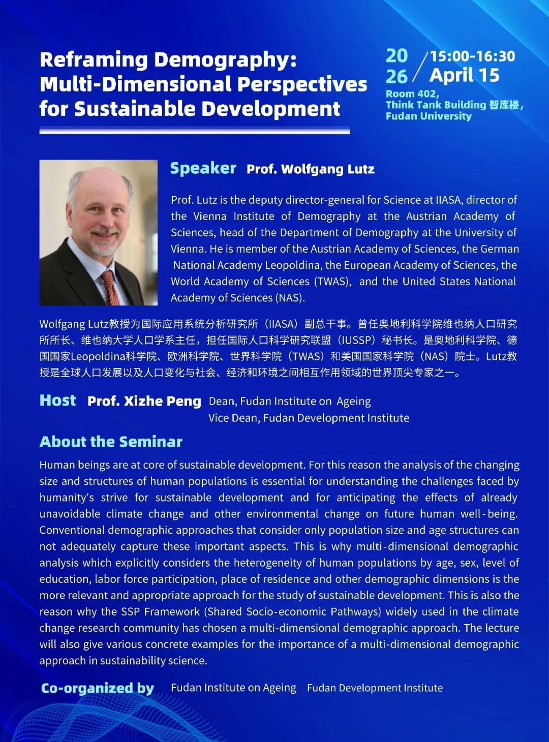 Wolfgang Lutz教授为国际应用系统分析研究所(IIASA)副总干事。曾任奥地利科学院维也纳人口研究所所长、维也纳大学人口学系主任,担任国际人口科学研究联盟(IUSSP)秘书长。 Lutz教授是奥地利科学院、德国国家Leopoldina科学院、欧洲科学院、世界科学院(TWAS)和美国国家科学院(NAS)院士,是全球人口发展以及人口变化与社会、经济和环境之间相互作用领域的世界顶尖专家之一。