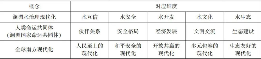 澜湄水治理现代化包含水互信、水安全、水开发、水文化与水生态五大核心维度。这既是对人类命运共同体强调“伙伴关系、安全格局、经济发展、文明交流、生态建设”的直接体现(见图1),又突显全球南方现代化中“人民至上的现代化、和平安全的现代化、开放共赢的现代化、多元包容的现代化、生态友好的现代化”的本质特征(见表1)。