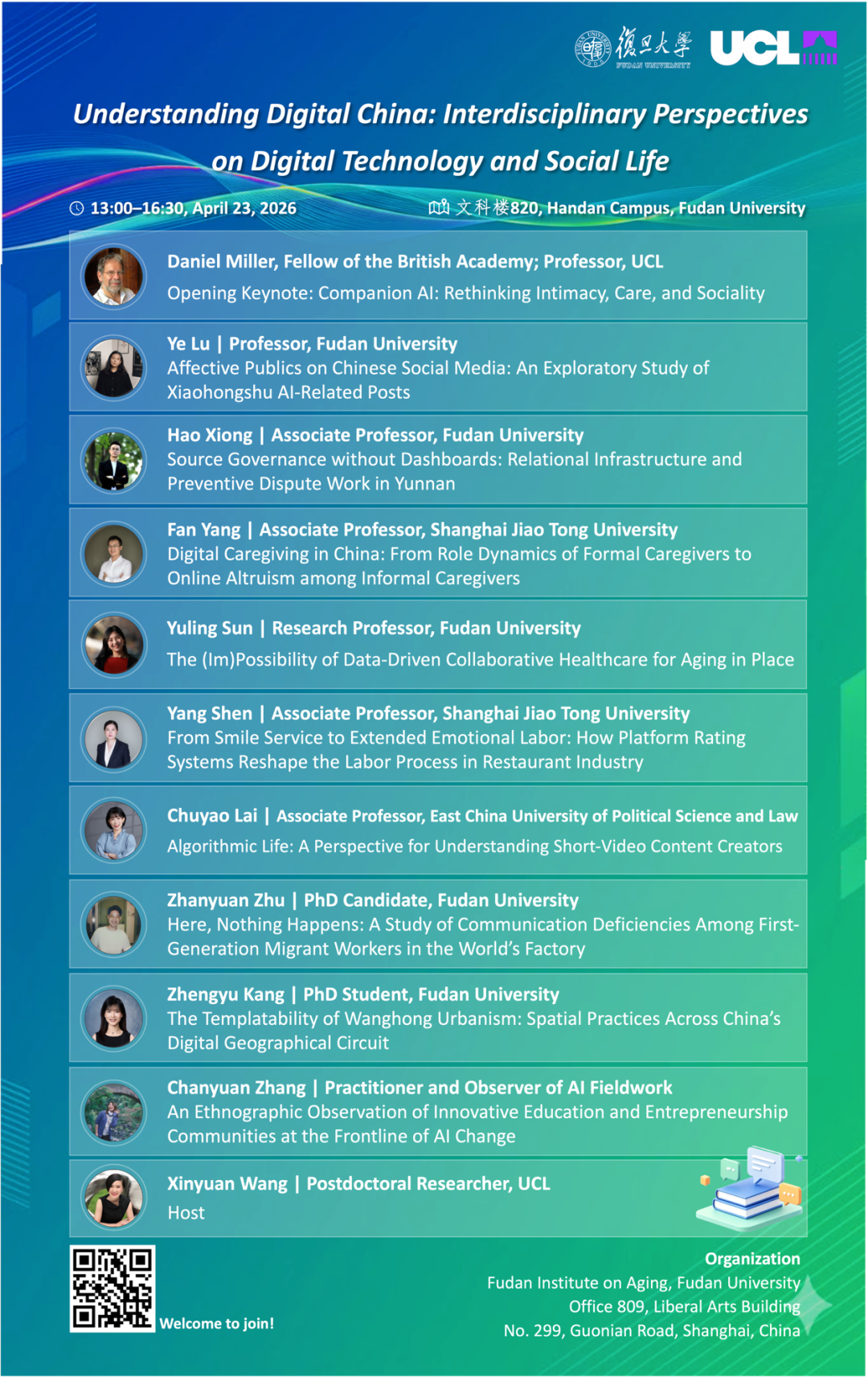 数字技术正在持续而深刻地重塑着社会运行方式以及人们的日常生活。然而,数字技术的重要性并不只在于技术本身,更在于它如何在具体的社会实践中被使用、理解和协商。在此背景下,复旦大学老龄研究院联合伦敦大学学院数字人类学中心共同举办跨学科论坛 「理解数字中国:AI时代下的数字技术与社会生活」,邀请来自人类学、法学、新闻传播学、公共管理与老龄研究等领域的多位学者,围绕数字技术与人工智能如何进入日常生活、改变社会关系与结构展开讨论,关注数字化转型、平台劳动、智能养老、算法与生活等多个议题。
