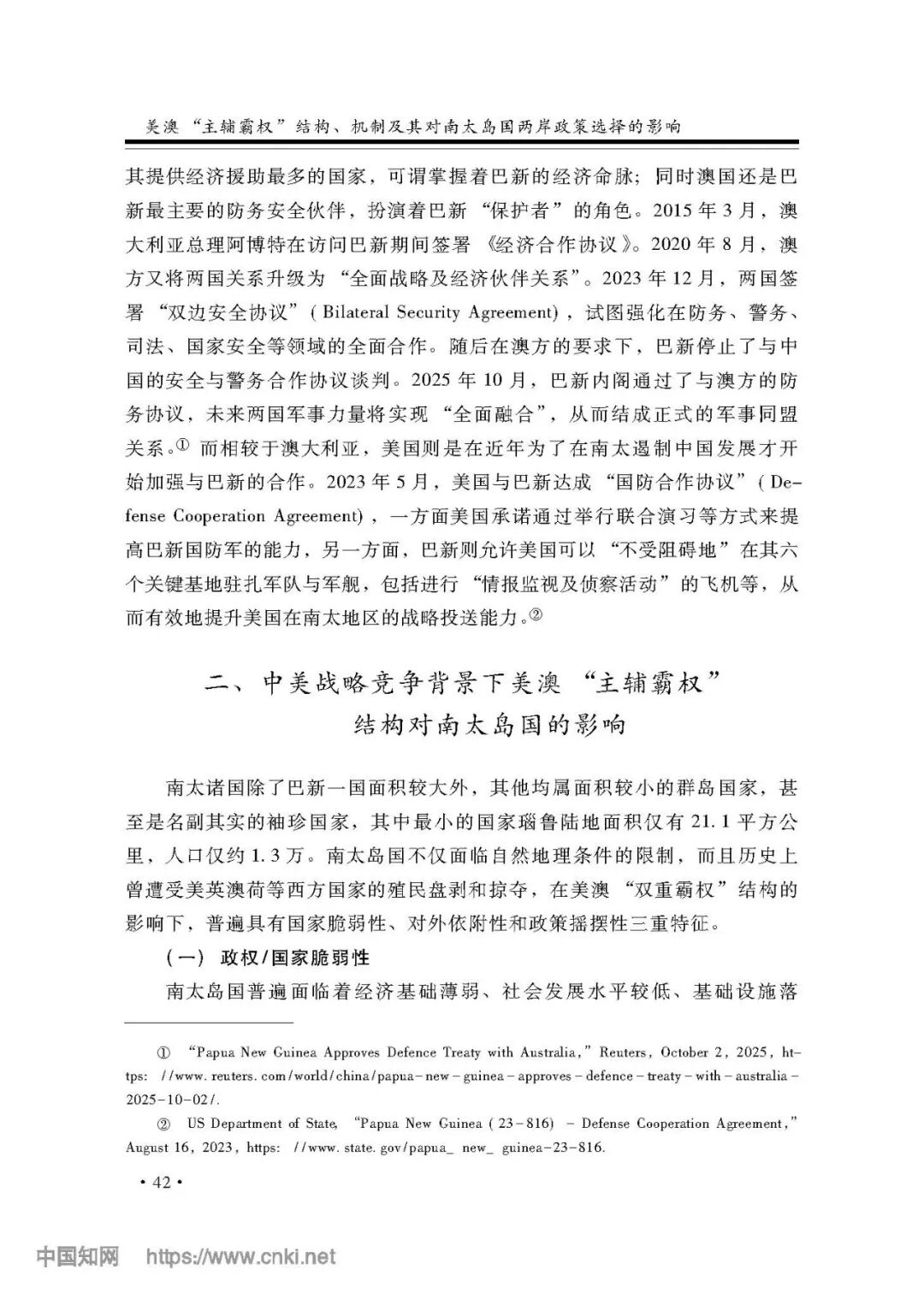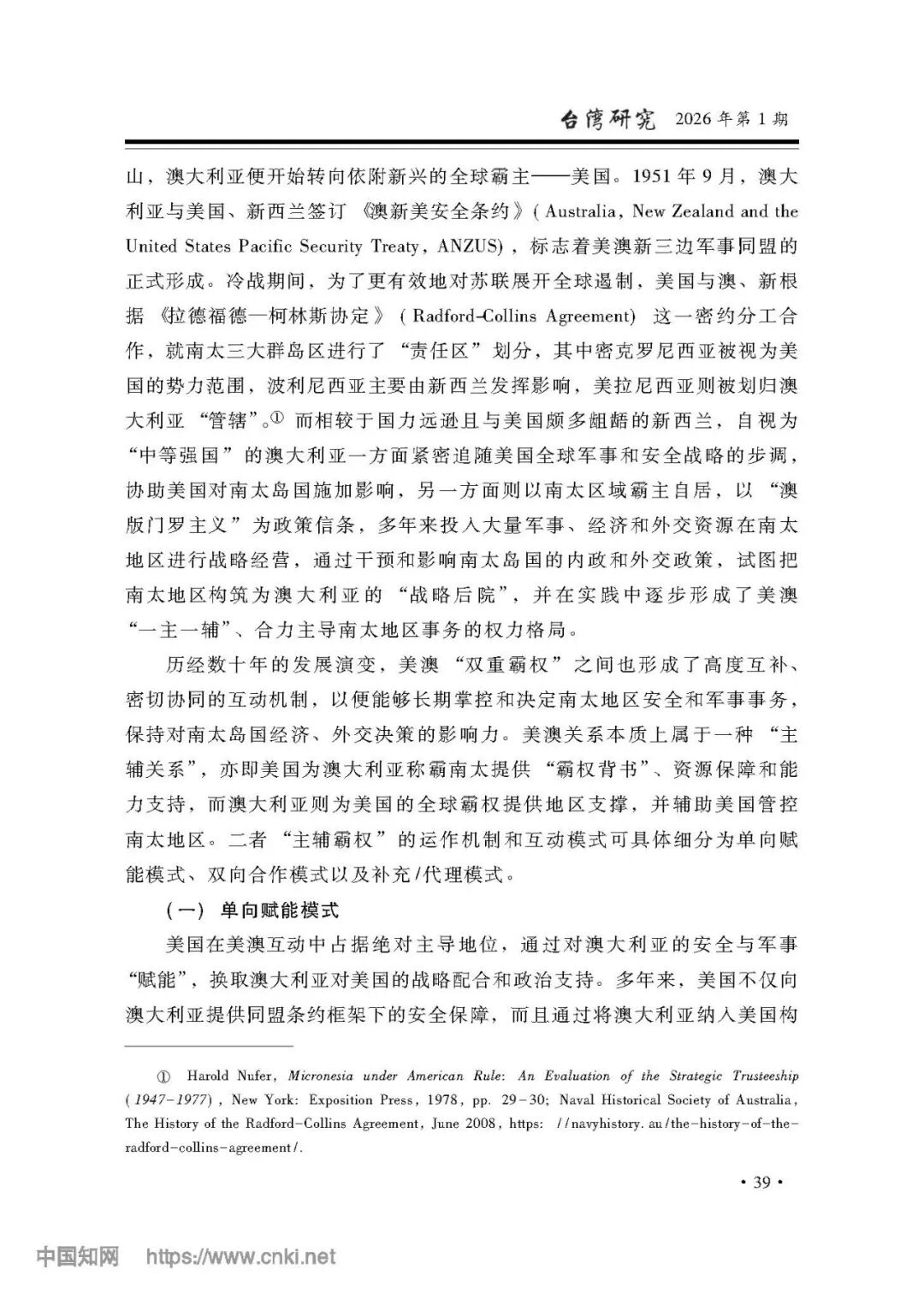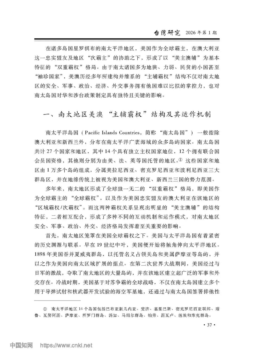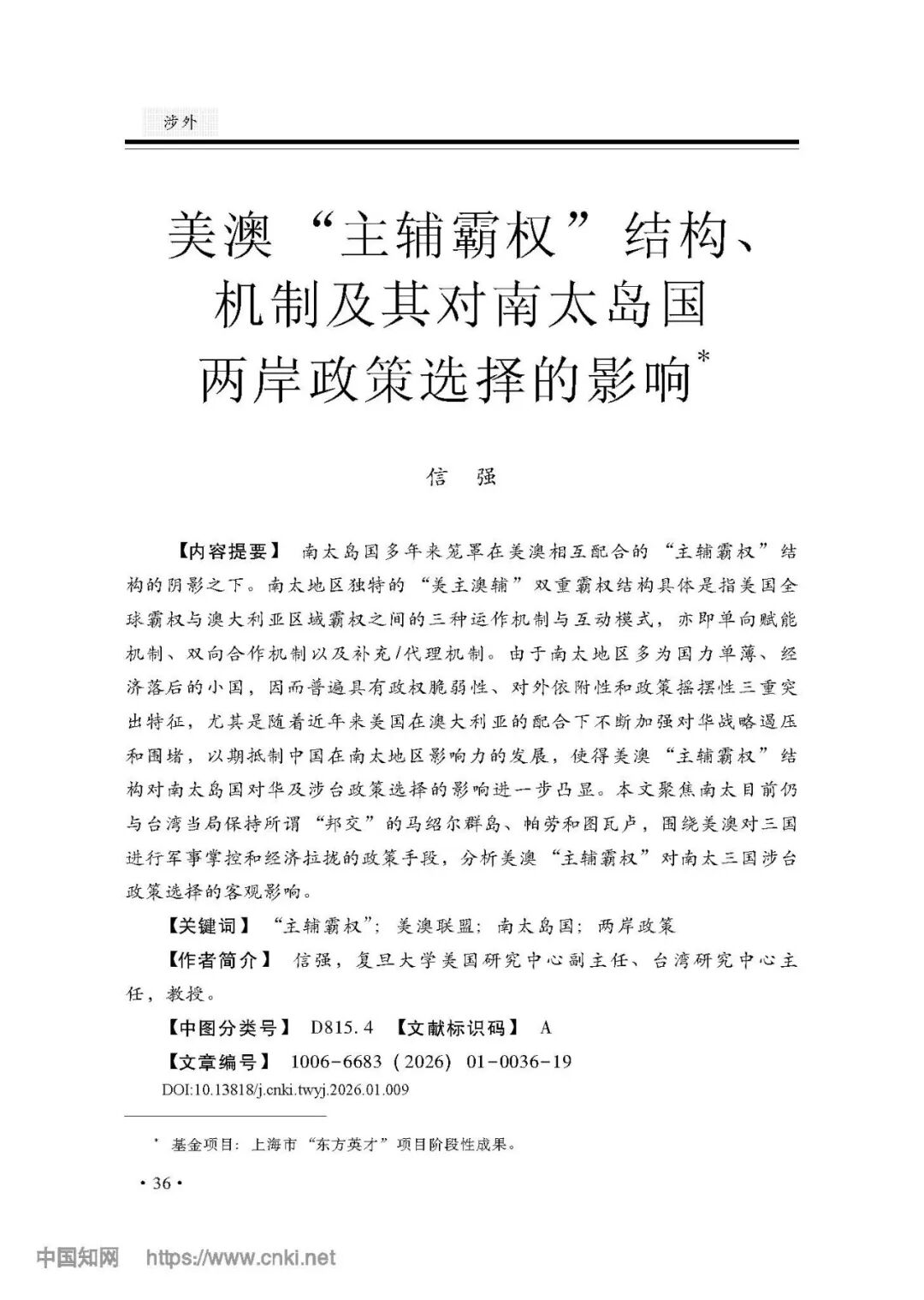信强:《美澳“主辅霸权”结构、机制及其对南太岛国两岸政策选择的影响》,载《台湾研究》,2026年第1期,第36-54页。