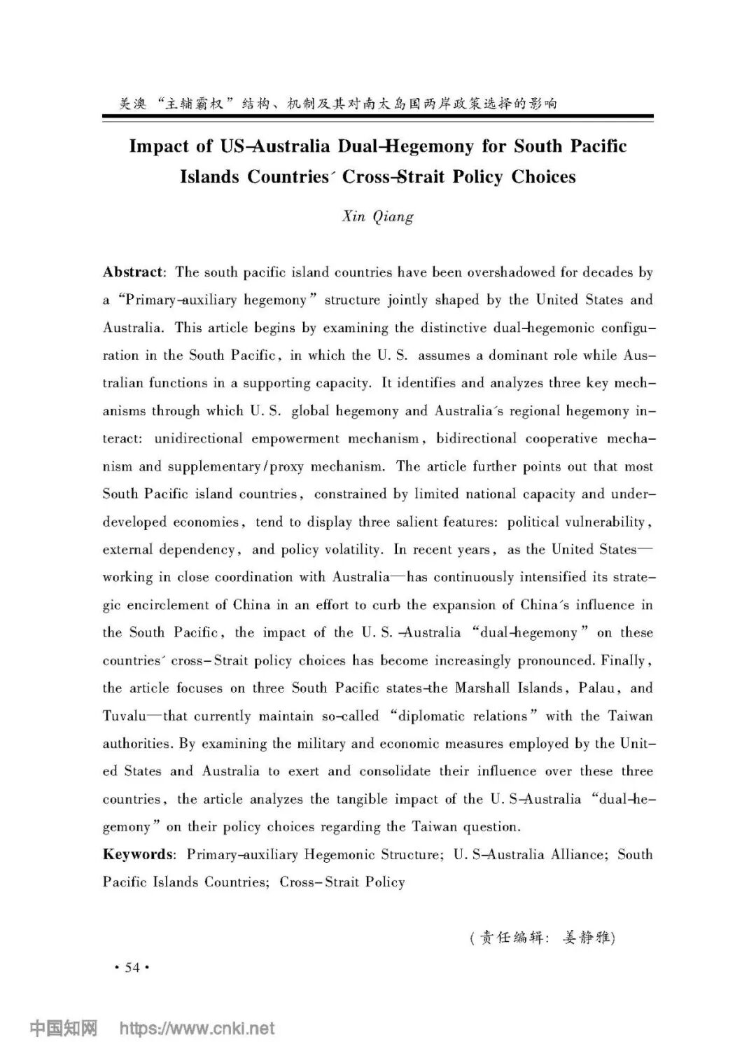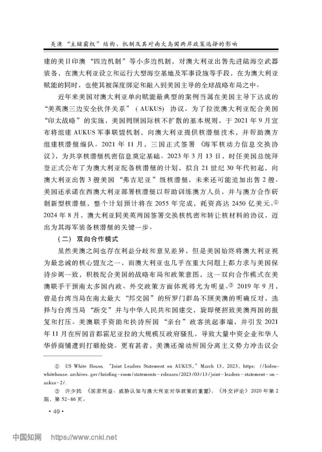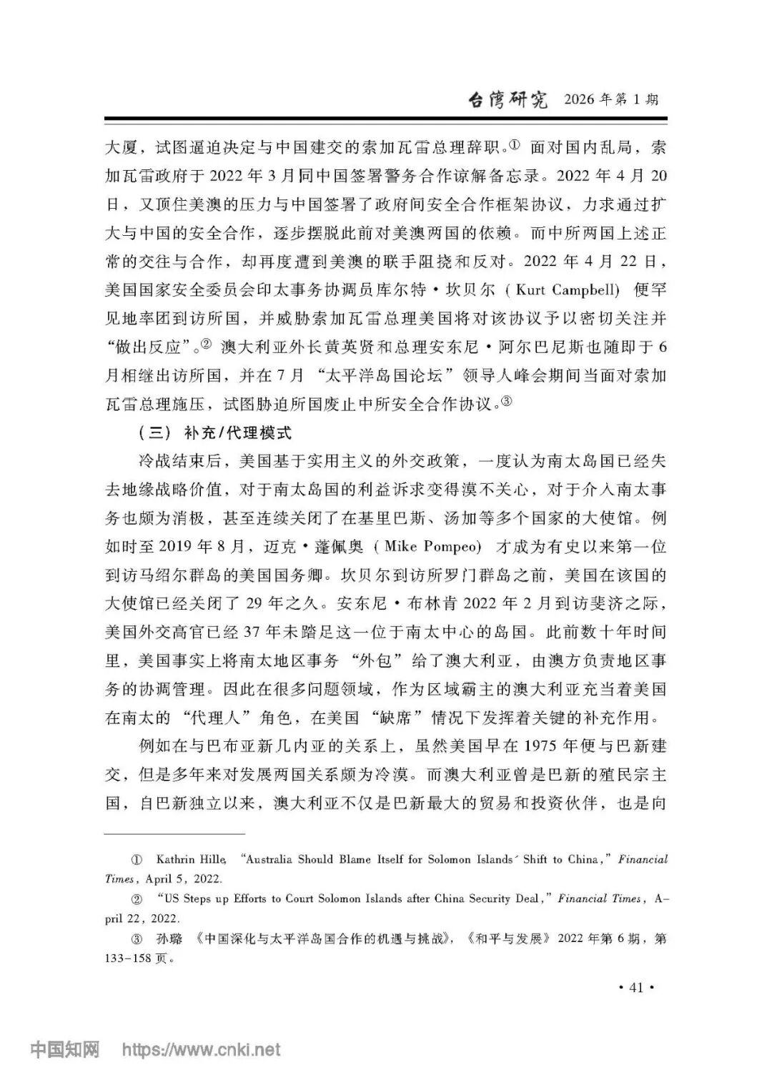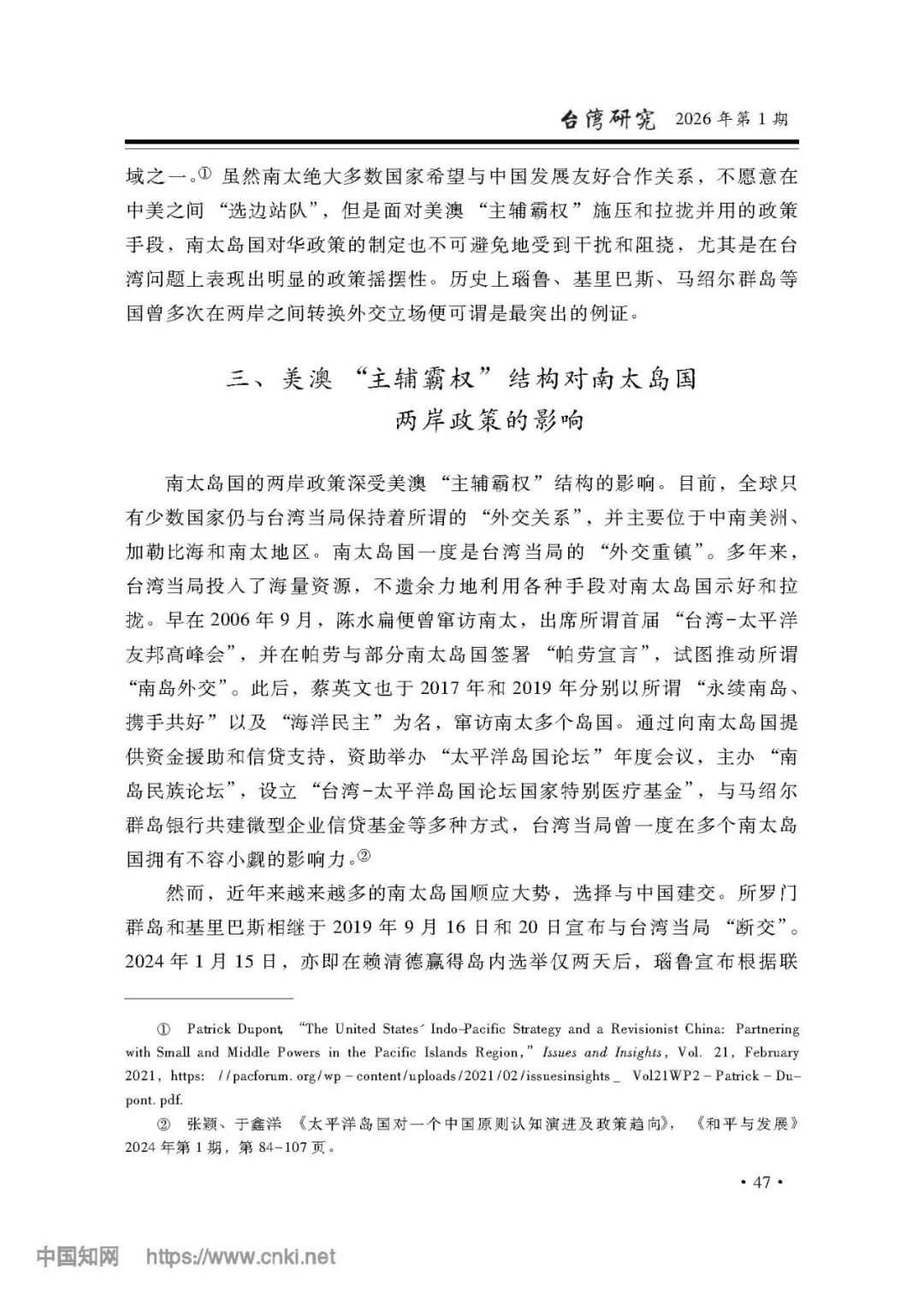 信强:《美澳“主辅霸权”结构、机制及其对南太岛国两岸政策选择的影响》,载《台湾研究》,2026年第1期,第36-54页。