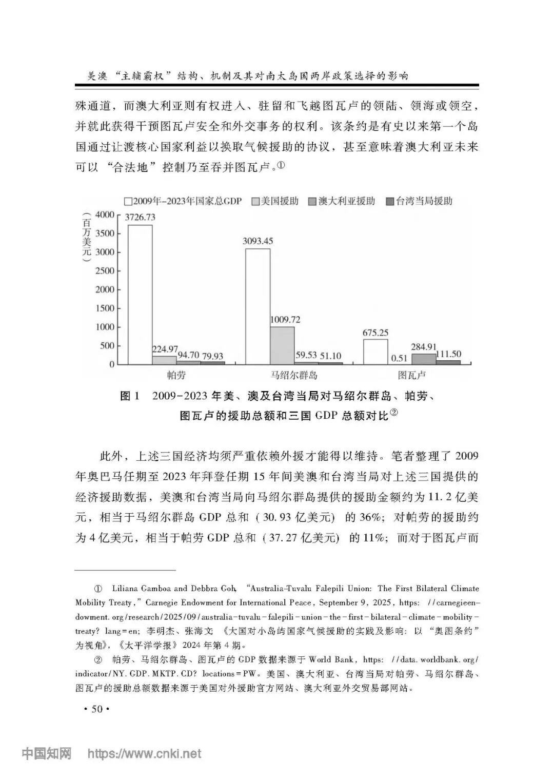 南太岛国多年来笼罩在美澳相互配合的“主辅霸权”结构的阴影之下。南太地区独特的“美主澳辅”双重霸权结构具体是指美国全球霸权与澳大利亚区域霸权之间的三种运作机制与互动模式,亦即单向赋能机制、双向合作机制以及补充/代理机制。由于南太地区多为国力单薄、经济落后的小国,因而普遍具有政权脆弱性、对外依附性和政策摇摆性三重突出特征,尤其是随着近年来美国在澳大利亚的配合下不断加强对华战略遏压和围堵,以期抵制中国在南太地区影响力的发展,使得美澳“主辅霸权”结构对南太岛国对华及涉台政策选择的影响进一步凸显。本文聚焦南太目前仍与台湾当局保持所谓“邦交”的马绍尔群岛、帕劳和图瓦卢,围绕美澳对三国进行军事掌控和经济拉拢的政策手段,分析美澳“主辅霸权”对南太三国涉台政策选择的客观影响。