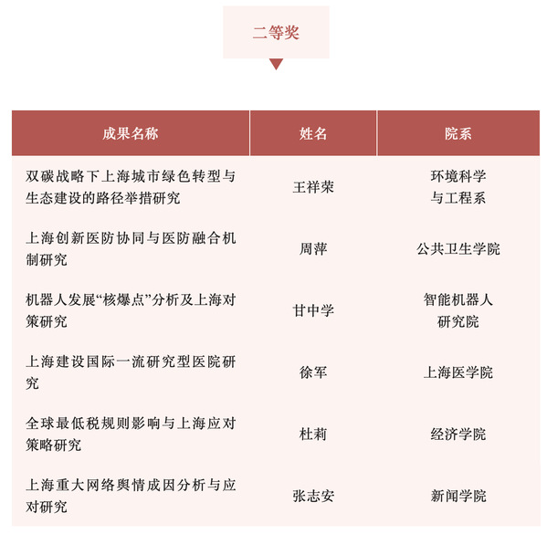 日前,第十五届上海市决策咨询研究成果奖名单公布,全市共评选出80项获奖成果(20项一等奖、40项二等奖、20项三等奖),复旦大学获一等奖2项、二等奖6项、三等奖3项,11项获奖位列全市第一。这11项获奖成果,涵盖多个学科领域,兼具科技前沿与社会应用,体现跨学科融合与政策导向,彰显了复旦大学在基础研究、应用研究与政策研究方面的综合性优势。