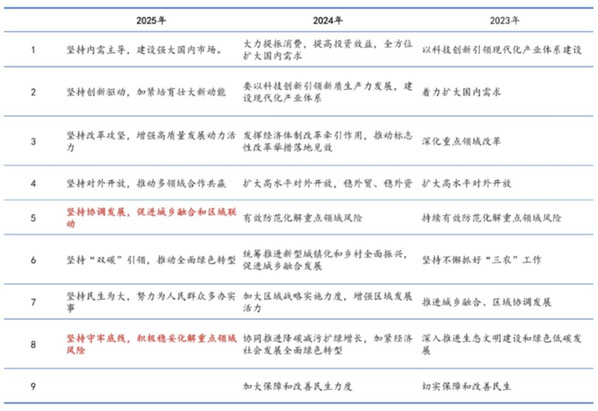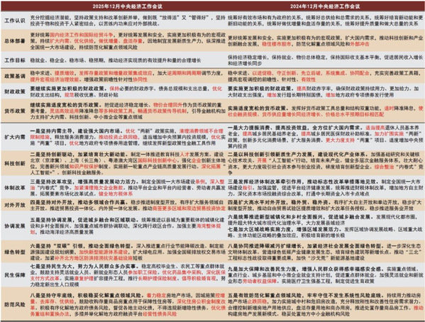 对比2024年中央经济工作会议:更好统筹发展和安全,实施更加积极有为的宏观政策,扩大国内需求,推动科技创新和产业创新融合发展,稳住楼市股市,防范化解重点领域风险和外部冲击,稳定预期、激发活力,推动经济持续回升向好,不断提高人民生活水平,保持社会和谐稳定。