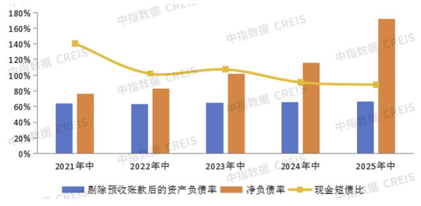 2025上半年,中国房地产上市公司财务风险持续攀升,偿债能力进一步弱化。数据显示,上市房企剔除预收账款后的资产负债率达66.5%,同比上升0.9个百分点;净负债率大幅上升至171.8%,同比激增55.8个百分点,反映出行业整体杠杆水平居高不下。