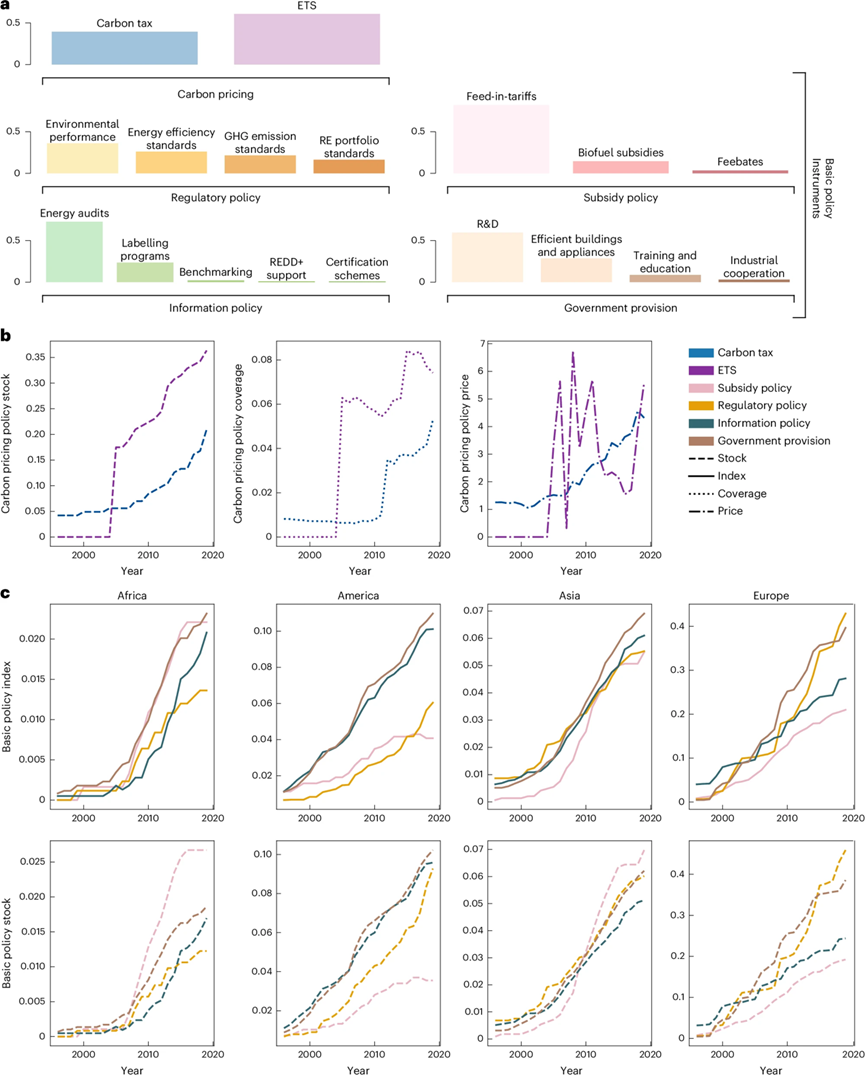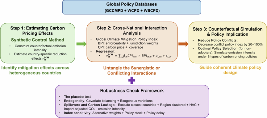 在气候变化领域综合性顶刊Nature Climate Change在线发表研究论文:Cross-National Comparative Assessment of Synergies and Conflicts in Climate Policy Mixes。研究整合了覆盖全球124个国家、连续20年、超过一万项气候政策的全球数据库,基于人工智能方法构建全球气候政策指数,将原本难以比较的异质性政策体系转化为可计算、可比较、可解释的分析对象,利用合成控制方法识别碳税与碳排放交易体系的减排效果,并进一步对复杂政策体系中交互效果进行识别。