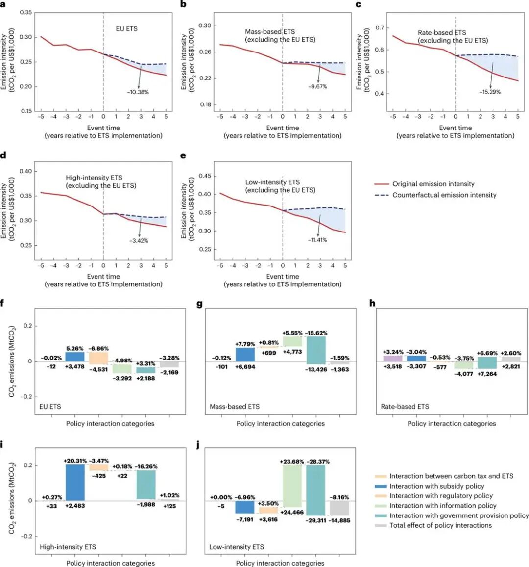 研究结果显示,在全球平均水平下,碳排放权交易体系(ETS)和碳税分别能使排放强度降低约15.4%和8.5%。然而这一效果在不同政策组合下表现出显著差异:
