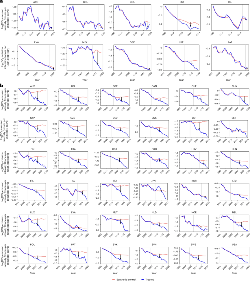 l碳定价政策效果评估:利用合成控制法,为每个实施碳定价的国家构建反事实基准,精准剥离出碳定价带来的实际减排贡献。