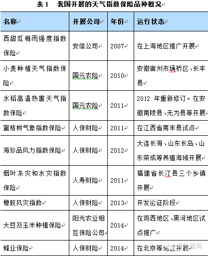 近年来,我国天气指数保险试点不断增多,覆盖的范围也逐渐扩大。截至2014年5月,全国正在实施和预备实施的天气指数保险品种有9种,区域集中在中东部地区,保险保障范围涵盖了水产养殖业和种植业。