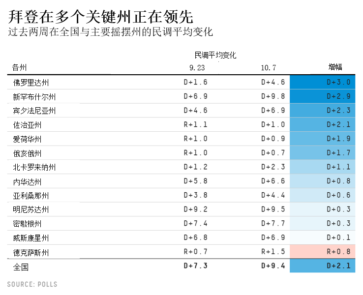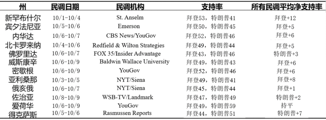 摇摆州的民调数据。数据来源:Real Clear Politics。