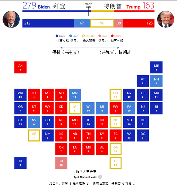 两党候选人在各州的选举人票情况。图片来源:CBS。