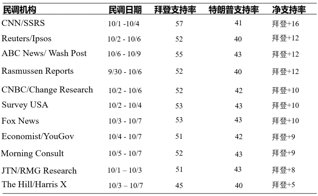 第一,在总统大选民意调查中,目前拜登的支持率平均高特朗普10个百分点,这是二人竞选以来的最大差幅。值得注意的是,在CNN / SSRS的全国民意调查中,拜登获得了令人瞩目的16分领先;在倾向共和党的拉斯姆森最新民调中,拜登也领先了特朗普12个百分点。长期以来的抗疫不利加上确诊阳性,特朗普在部分民调中失分严重,工作支持率已至竞选以来的历史最低点(49%)。不过也有民调呈现相反的结果。曾成功预测英国脱欧和特朗普2016年胜选的美国民主研究所(Democracy Institute)在其调查中发现特朗普目前在以46%比45%领先拜登;在佐格比最新民调中(John Zogby Strategies)民意调查显示,拜登仅仅保持2%的领先水平。