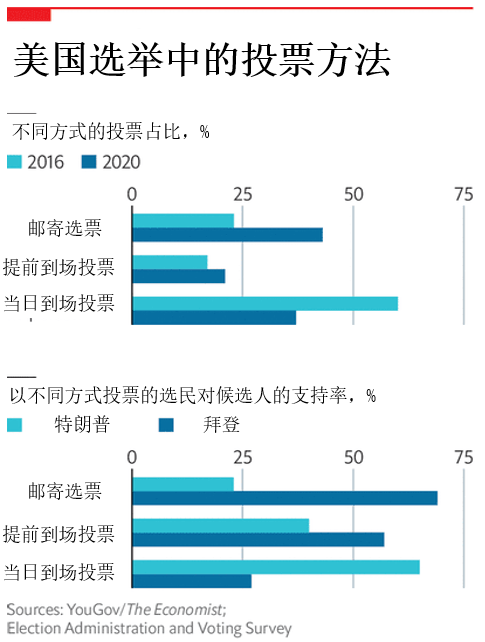 不同方式的投票占比与美国选民的支持率。图片来源:The Economist。