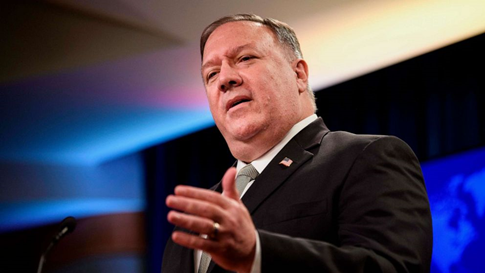 美国国务卿蓬佩奥在国务院发表讲话。