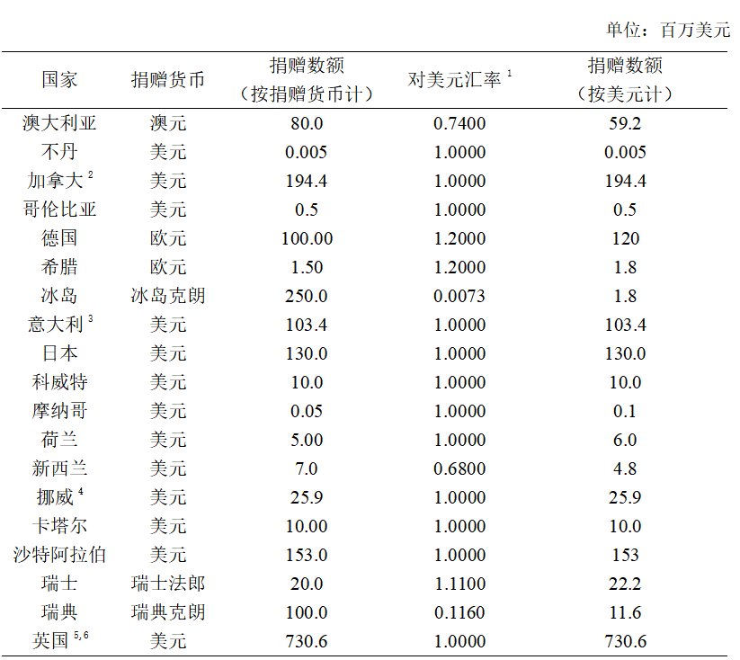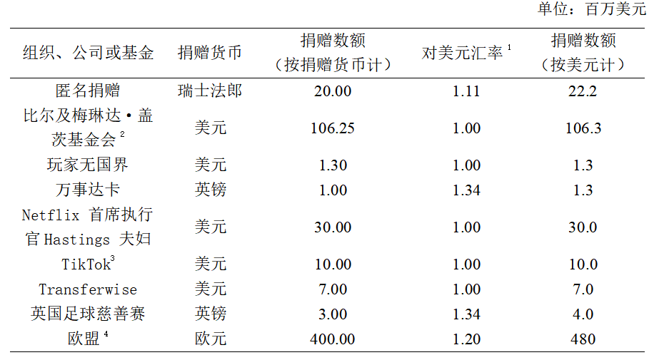 COVAX预先市场承诺机制组织机构捐赠数额一览表。