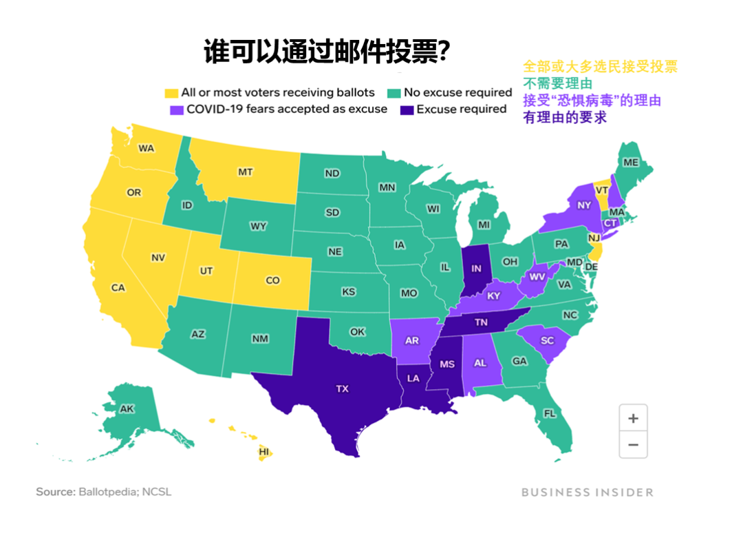 各州关于邮寄投票的要求。来源:Business Insider。