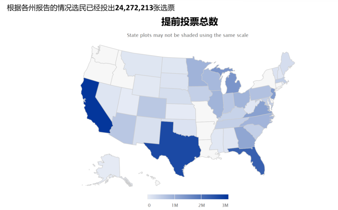 总体提前投票情况,截至2020年10月17日。来源:U.S. Elections Project。
