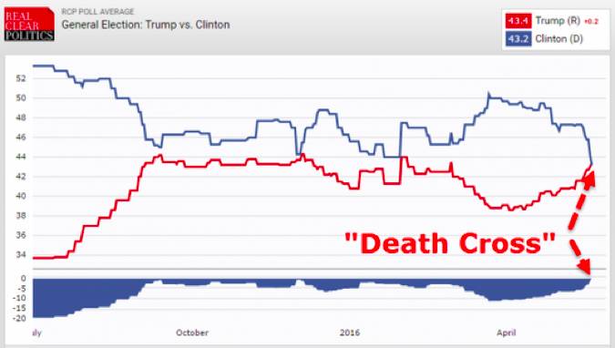 5月25日,美国国务院监察长办公室向美国国会递交一份长约80页的报告,对希拉里“私邮公用”的行为做出认定,认定她违反美国务院内部的有关规定。报告还指出,希拉里并未全力配合调查,拒绝接受面谈,也没有交出全部公务电邮。进入5月以后,希拉里与特朗普的支持率经历了死亡交叉。图中蓝线显示,希拉里的支持率近期呈下降趋势,并已经低于特朗普的支持率(红线)。