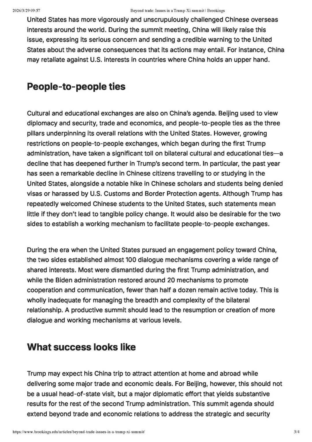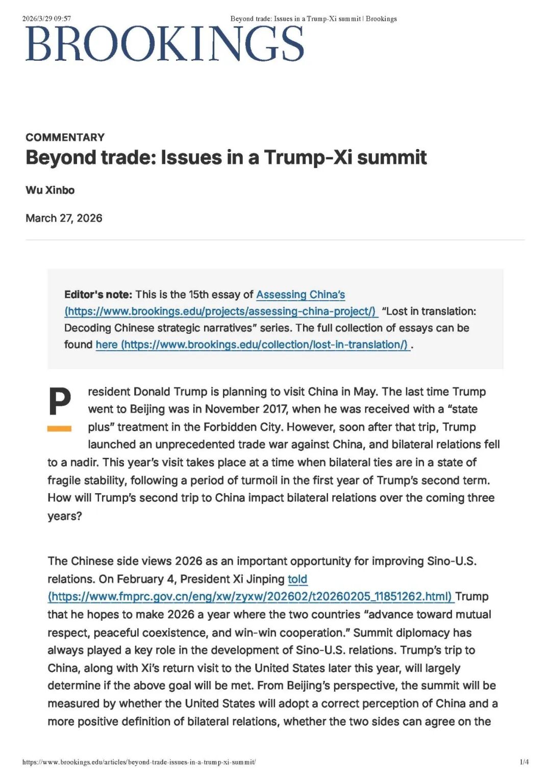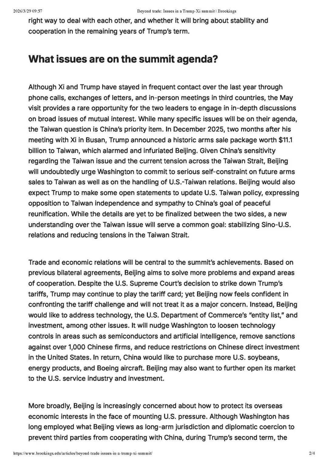 文章来源于布鲁金斯学会网站,2026年3月27日,原标题为“Beyond trade: Issues in a Trump-Xi summit”