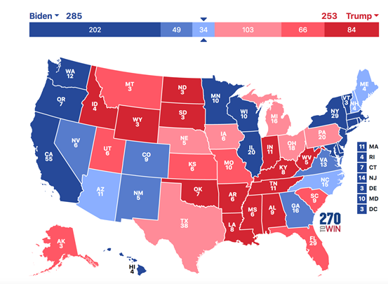 由于今年大选的投票方式包括三种:选举日亲自投票、提前亲自投票和邮寄选票,但是邮寄选票的计票仍未结束。第一种是结果已出,拜登或者特朗普的得票数已经超过注册选民的一半,则这位候选人一定能够得到此州的选举人票,例如得克萨斯(特朗普胜)、佛罗里达(特朗普胜)、科罗拉多(拜登胜)。第二种是阿拉斯加,时差原因计票未结束,几乎可以断定特朗普必胜。第三种情况存在较低的不确定性:已经完成大部分计票,某候选人领先优势较大(5%以上),但是由于邮寄投票清点较慢等原因,计票仍未结束,落后者反超可能性小。包括:备受关注的宾夕法尼亚已经完成了75%的计票(520万张以上),在这75%之中,特朗普得55%、拜登得到42%,目前看来,拜登若要在宾州扭转,难度较高。