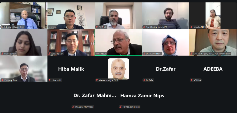 我院南亚研究中心主任张家栋教授、中东研究中心主任孙德刚教授、巴基斯坦研究中心主任章节根副教授、中东研究中心研究人员邹志强青年研究员、中东研究中心王晓宇青年副研究员等参加会议。巴方NIPS所长(Director General)阿什法克·哈桑博士(Dr. Ashfaque Hasan Khan)、研究部主任阿里·沙阿(Ali Shah)、高级研究员希巴·马利克(Hiba Malik)、迈拉·萨夫达尔(Maira Safdar)和赛义德·巴希姆·拉扎(Syed Basim Raza)等参加会议。双方学者围绕伊朗危机起源、伊朗回应合法性、波斯湾安全影响、国际能源安全冲击及未来发展趋势等议题展开深入交流。