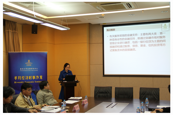 本次会议的议题是研讨课题组的报告——《如何以金融支持视角提升自贸区服务贸易竞争力》,会议由孙立坚教授主持。首先,本次课题组组长吴金铎博士对近年来金融支持服务贸易的相关研究进行梳理;然后,嵇欣博士把服务贸易发展的历程,分别从运输、旅游;咨询、其他商业服务、计算机信息服务等不同视角进行了国际比较;最后,张传勇博士介绍了调研情况,认为推进服务贸易的难点在于外汇管制、行业竞争严峻、银行收到VC的冲击、部门协调、内外资差异化等方面,他还代表黄菁博士介绍了中国服务贸易问题分行业分析的实证结果。各位领导和专家对博士后们的汇报进行了精彩点评,并提出宝贵建议。