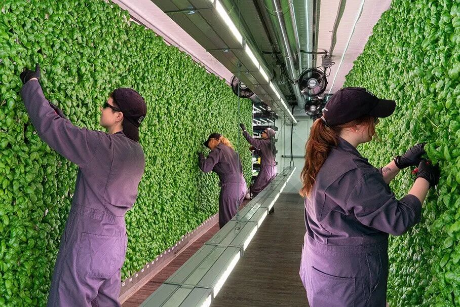 桑德斯说:“如果需要,机器人可以全天无休地采摘果实。这意味着人力可以用在别的工作上,大幅提高生产力。”他和他的团队也在开发能够收割其他农作物(比如芦笋)的机器人。他介绍道:“问题在于,没有一种通用的办法能采集所有蔬菜水果。摘苹果与摘草莓、蓝莓的方式完全不同,每种农作物都需要定制的机器人。”还有其他公司在研究自己的解决方案。例如,总部位于美国佛罗里达州的Harvest Crop Robotics公司正在研发能自动收割草莓的机器,剑桥大学的研究员则研制出了采摘生菜的机器人。但因为成本过高,农业机器人化很可能只有最富裕的农民才能用上。艾斯丘说:“在农业上使用机器人的最大障碍,肯定是农场主的投资能力。他们的经营利润相当微薄,要他们在前期斥巨资购买机器是一个巨大的挑战。”我们也看到了肉类行业在社交安全距离的限制下所面临的困境。肉类加工厂的确诊病例一直居高不下。尽管这些加工厂环境极其卫生,但厂里噪声巨大,工人们工作时只能大声叫喊,如此会释放出更多病毒。同时,要想不靠近别人就完成这项工作相当困难。大约90%的粮食都留在了产出国内或者所在的大陆境内,但这并不能避免粮食短缺。供应链上的很多食物都依赖于“及时系统”。这其实只是阻止人们将货物填满大型仓库的一种方式。就像英国超市的面粉短缺,我们有足够的食物,只是没有放在合适的地方。食品供应链是高度精确的网络,产品会以最快的速度运往商店。这就保证了食品的新鲜度,也意味着食品会尽可能少地留在货架上。在封锁期间,城市农场主和本地生产者证明了自己的价值。有人正以供应链的问题为证据,证明供应链系统已被打破,认为我们应该从微型生产商那里购买超本地化的产品。虽然我们确实需要减少供应链的环节,但创新者正在证明,我们可以同时实现本地化和规模化。地下农业表明,如果你知道寻找正确的地方,大城市里有空间进行规模化的农业生产。我们要做的,是更好地利用现有的土地。来源:“Four Square Roots farmers harvesting basil from vertical hydroponic towers inside an indoor urban farm.” Square Roots, squarerootsgrow.com/.
